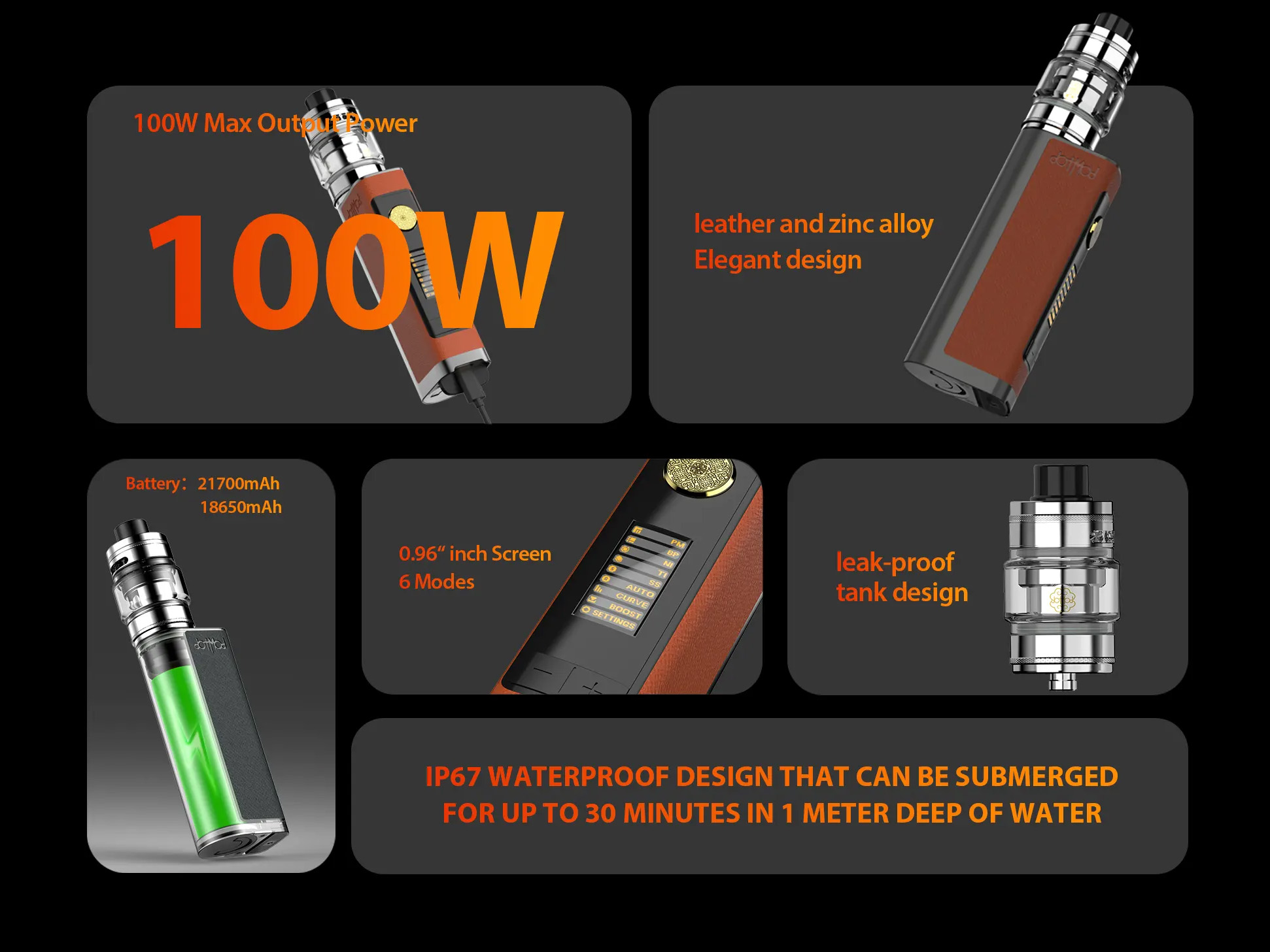 Мод функционирует при помощи вариативной фирменной платы с продвинутым интерфейсом и выходной мощность в диапазоне от 1 до 100 ватт. Помимо вариватта, доступны режимы температурного контроля, настройка кривых преднагрева, Bypass и Boost, а также режим с автоподстройкой под сопротивление намотки. В качестве источника питания можно использовать три формата аккумуляторов — 21700, 20700 и 18650 при помощи адаптера. Сопротивление может варьироваться в пределах от 0,1 до 5,0 Ом.