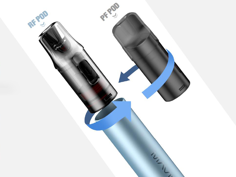 6 июня в рядя интернет-магазинов появился компактный стартовый набор — Mavic Pro RF Pod Kit, выпущенный компанией Smok. Девайс облачили в цилиндрический алюминиевый корпус без излишнего декора. Минимализм конструкции не стали нарушать кнопками и элементами управления. Сверху, при помощи магнитного коннектора зафиксировали полупрозрачный картридж с эргономичным мундштуком. В качестве украшения на боковой стенке сделали скромный контрастный логотип. Срезанное дно укомплектовали USB-портом и маленьким индикатором.