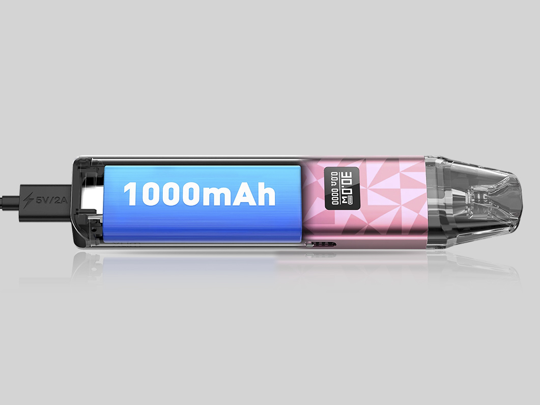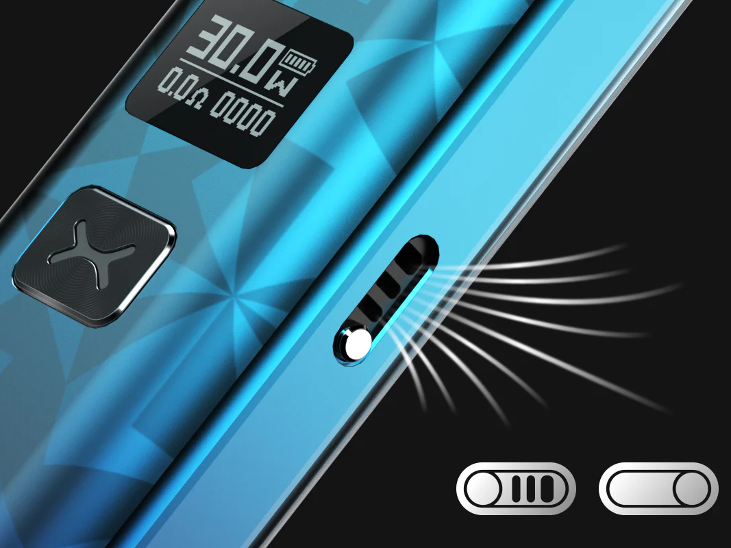 Активацию можно производить как по нажатию кнопки, так и по затяжке. Регулируемая плата располагает лаконичным одноцветным интерфейсом и выходной мощностью в пределах от 5 до 30 ватт. Обдув настраивается при помощи ползунка. Источником питания выступает встроенная батарея емкостью 1000 мАч. Зарядка через USB Type-C порт займет не более 30 минут. В запасе предусматриваются два сменных картриджа с интегрированной намоткой на 0,6 и 0,8 Ом, а также удобной боковой заправкой.