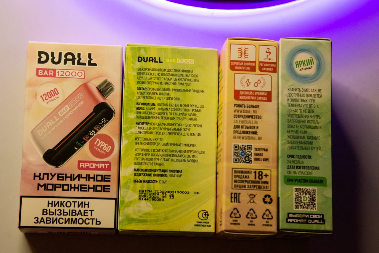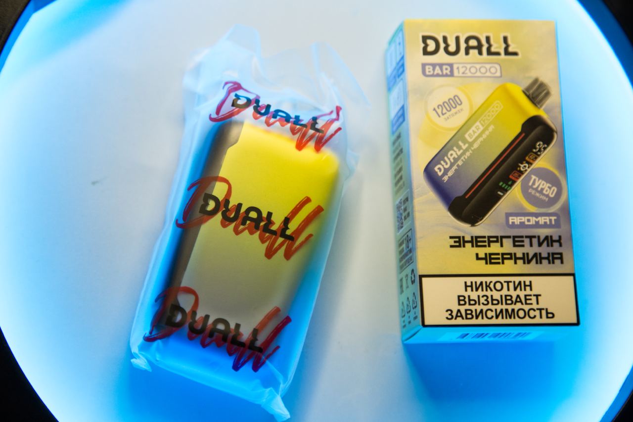 Серия вкусов DUALL BAR 12000 поставляется в красочных картонных коробках. Цветовая гамма оформления зависит от выбранного вкуса. На лицевой стороне расположен логотип бренда, название линейки, название вкуса жидкости на русском языке, указано расчетное количество затяжек, пометка о наличии режима повышенной мощности испарения и предупреждение на белом фоне. На боковых гранях размещены предупреждения, срок годности, QR-коды, ключевые характеристики устройства, контактные данные производителя и маркировки. Информационный блок находится на обратной стороне упаковки: описание продукта, состав, юридические данные, содержание никотина и объем жидкости. На верхней крышке дублировано название линейки и вкуса, а на нижней помещен штрихкод.