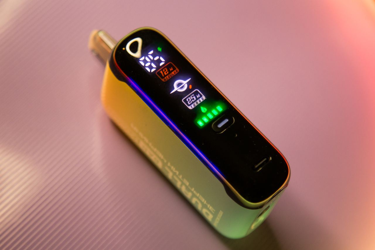 Внутри — девайс в запечатанном прозрачном индивидуальном пакете, дополнительно защищенный от загрязнения и циркуляции воздуха силиконовой заглушкой и наклейкой. На корпусе дублировано название линейки и вкуса, а на боковой грани находится экран с индикацией заряда аккумулятора и уровня жидкости, а также переключатель между режимами интенсивности работы испарителя и порт Type-C для подзарядки. На верхней части мода располагается мундштучек, через который выходит пар, а на нижней — забор воздуха с регулировкой затяжки.