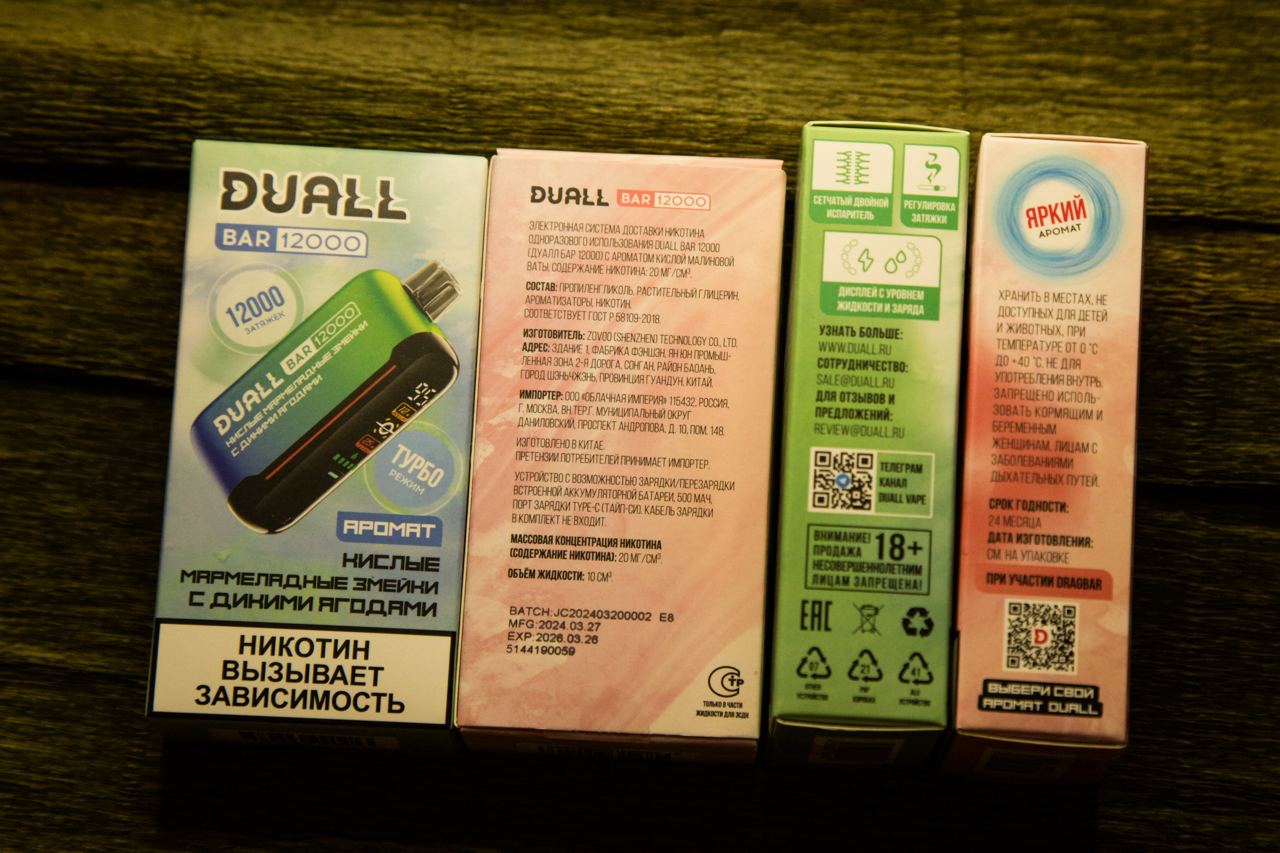 Серия вкусов DUALL BAR 12000 поставляется в красочных картонных коробках. Цветовая гамма оформления зависит от выбранного вкуса. На лицевой стороне расположен логотип бренда, название линейки, название вкуса жидкости на русском языке, указано расчетное количество затяжек, пометка о наличии режима повышенной мощности испарения и предупреждение на белом фоне. На боковых гранях размещены предупреждения, срок годности, QR-коды, ключевые характеристики устройства, контактные данные производителя и маркировки. Информационный блок находится на обратной стороне упаковки: описание продукта, состав, юридические данные, содержание никотина и объем жидкости. На верхней крышке дублировано название линейки и вкуса, а на нижней помещен штрихкод.