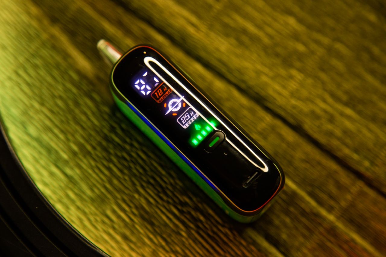 Внутри — девайс в запечатанном прозрачном индивидуальном пакете, дополнительно защищенный от загрязнения и циркуляции воздуха силиконовой заглушкой и наклейкой. На корпусе дублировано название линейки и вкуса, а на боковой грани находится экран с индикацией заряда аккумулятора и уровня жидкости, а также переключатель между режимами интенсивности работы испарителя и порт Type-C для подзарядки. На верхней части мода располагается мундштучек, через который выходит пар, а на нижней — забор воздуха с регулировкой затяжки.