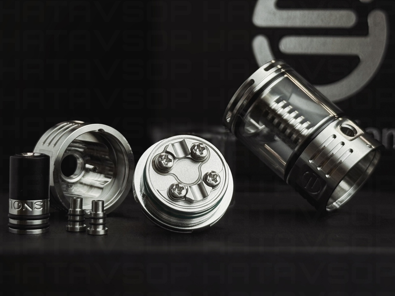 Внутри находится минималистичная база без стоек, позволяющая зафиксировать одну спираль, намотанную в любом направлении. Ножки фиксируются в горизонтальной плоскости при помощи винтов с крестовыми шлицами. На бортах базы имеются полукруглые вырезки для выравнивания спирали. Резервуар заправляется снизу и вмещает 4 мл жидкости. Обдув поступает на намотку с боков и регулируется при помощи комплекта сменных воздушных втулок. Набор предусматривает восемь пар разнообразных вставок с разнокалиберными каналами, позволяющих устанавливать как очень тугую, так и свободную затяжку.