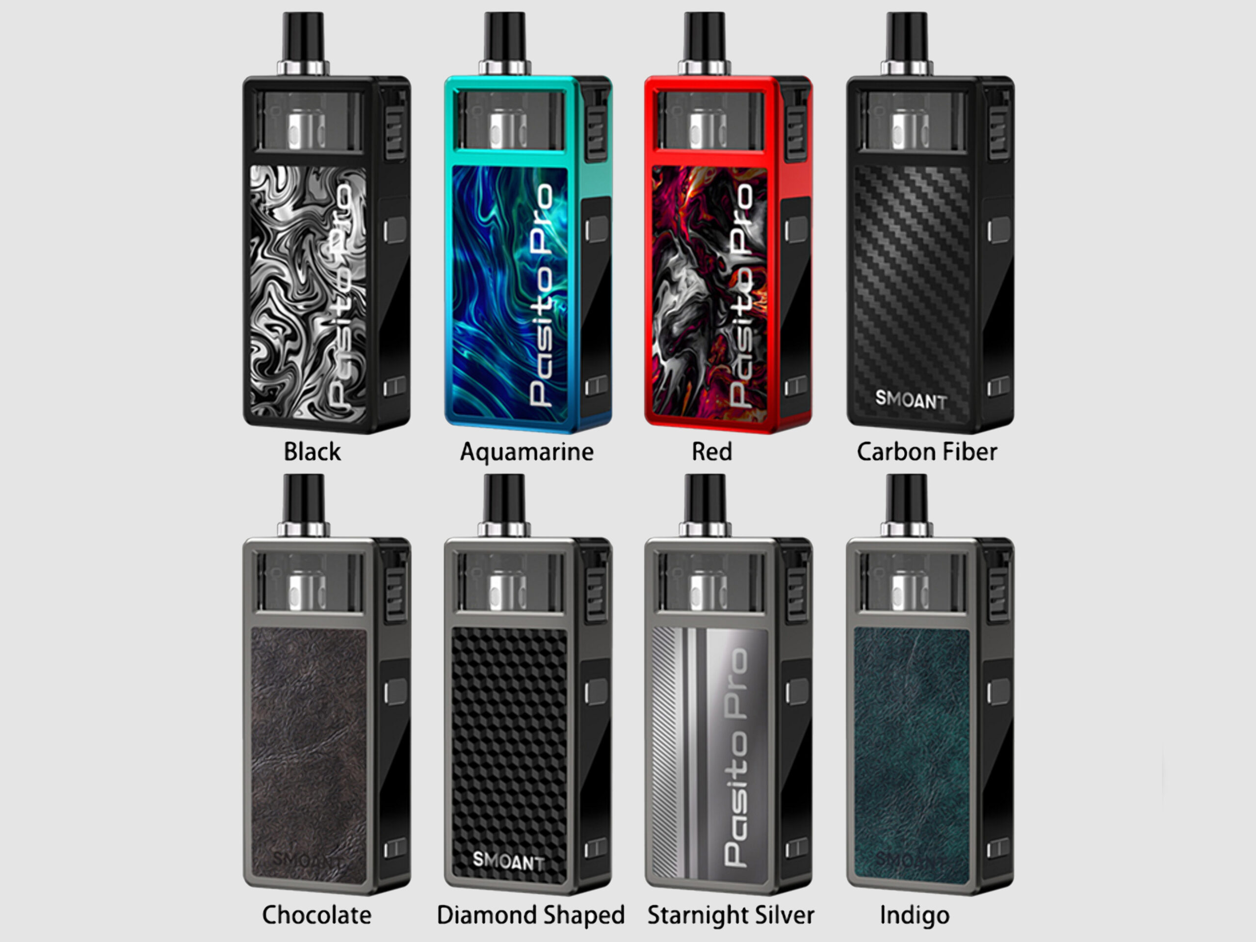 17 июля компания Smoant анонсировала на странице в фейсбуке функциональный девайс — Pasito Pro Kit. Обновленная под-система получила добротный прямоугольный корпус, реализованный в знакомом фирменном стиле из цинкового сплава. Широкие боковины декорировали крупными панелями, исполненными в восьми версиях из контрастной эпоксидки, углепластика либо экокожи. Массивный картридж обеспечили дополнительной рамой, а также снабдили регулятором обдува и удобным заправочным отверстием, находящимся на боковой стенке под герметичной заглушкой. На узкой стороне расположили панель управления, состоящую из небольшой кнопки зажигания, дисплея и пары маленьких клавиш. USB-порт обосновался на дне.