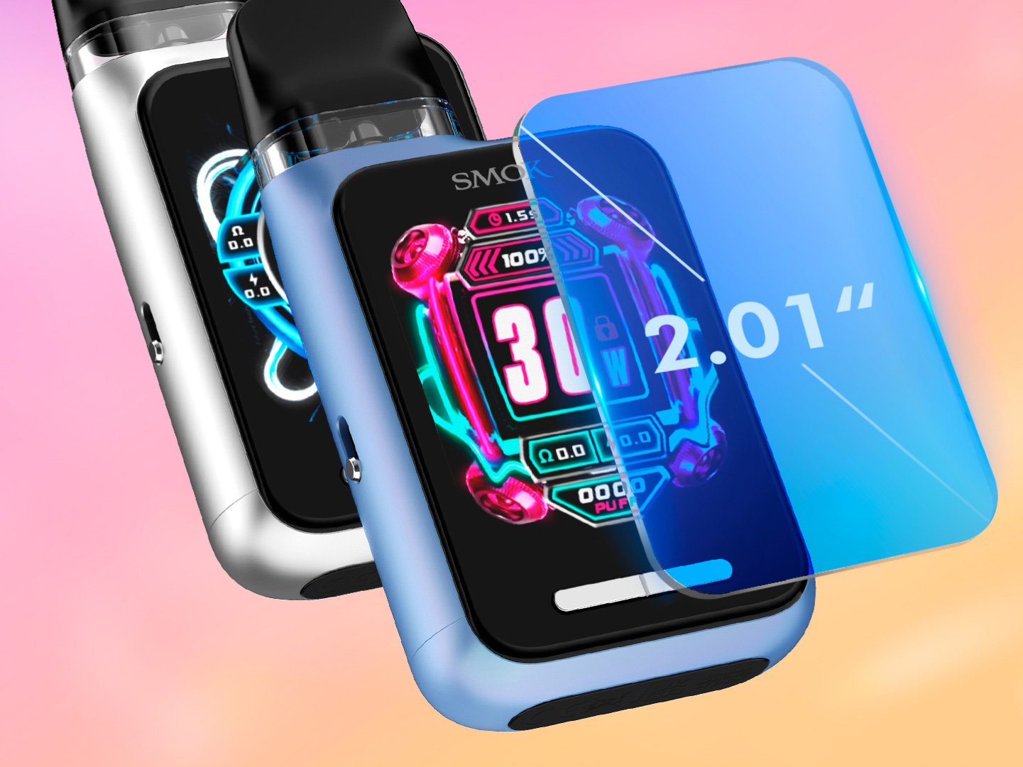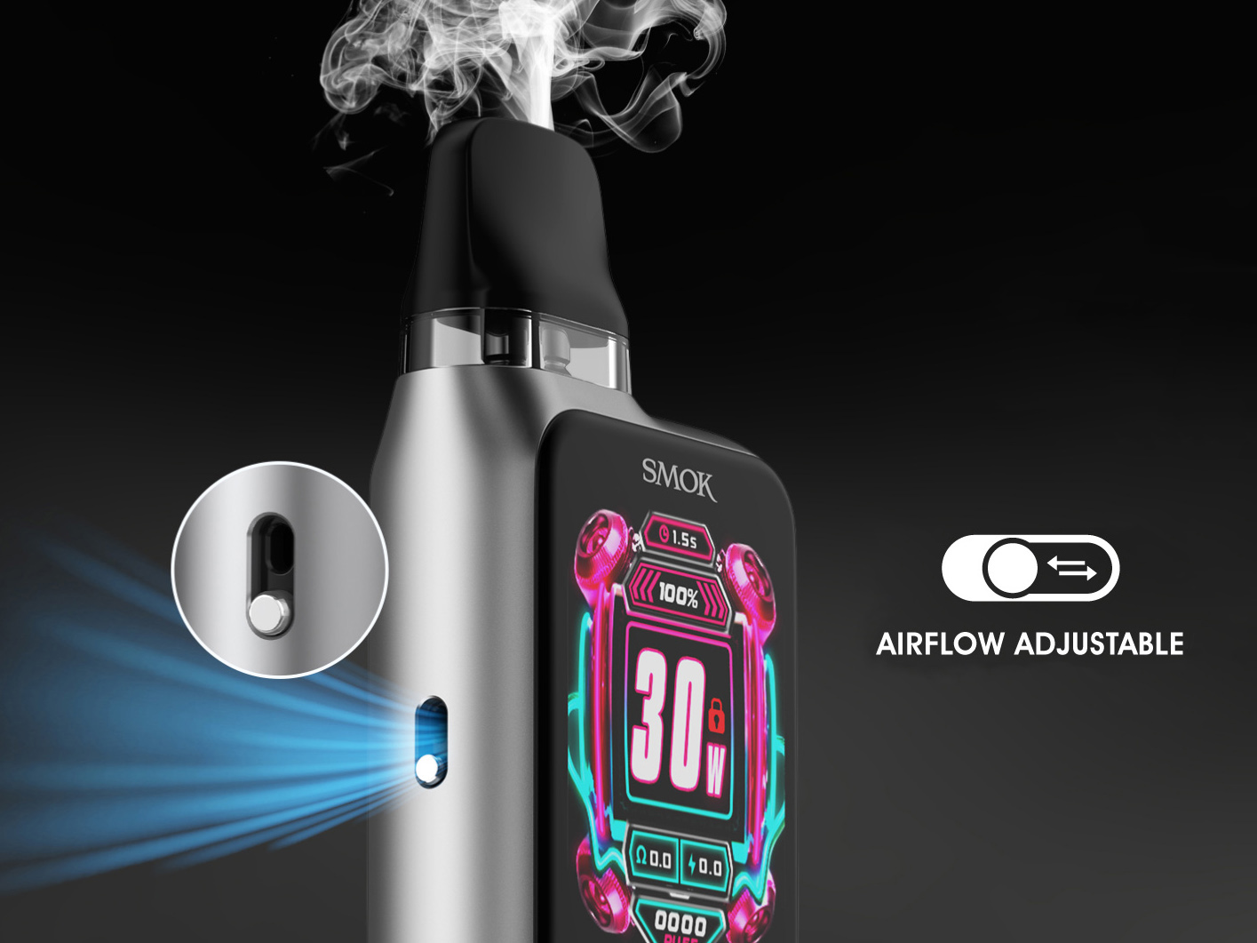 Под-система может активироваться как по нажатию кнопки, так и по затяжке. Функциональная плата предусматривает яркий информативный интерфейс с вариативным визуальным оформлением и регулируемую мощность в пределах от 5 до 30 ватт. Помимо того, предусматривается возможность настройки обдува. Питание обеспечивается вместительной батареей на 1700 мАч. Зарядку следует осуществлять через USB Type-C током в 1,2А. Комплектные сменные картриджи реализуются в двух экземплярах с различными сеточными испарителями на 0,6 и 0,8 Ом. Также в отдельно продаже доступен вариант с сопротивлением в 1,2 Ом. Объем бака во всех вариациях составляет 2 мл.