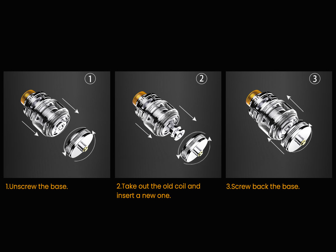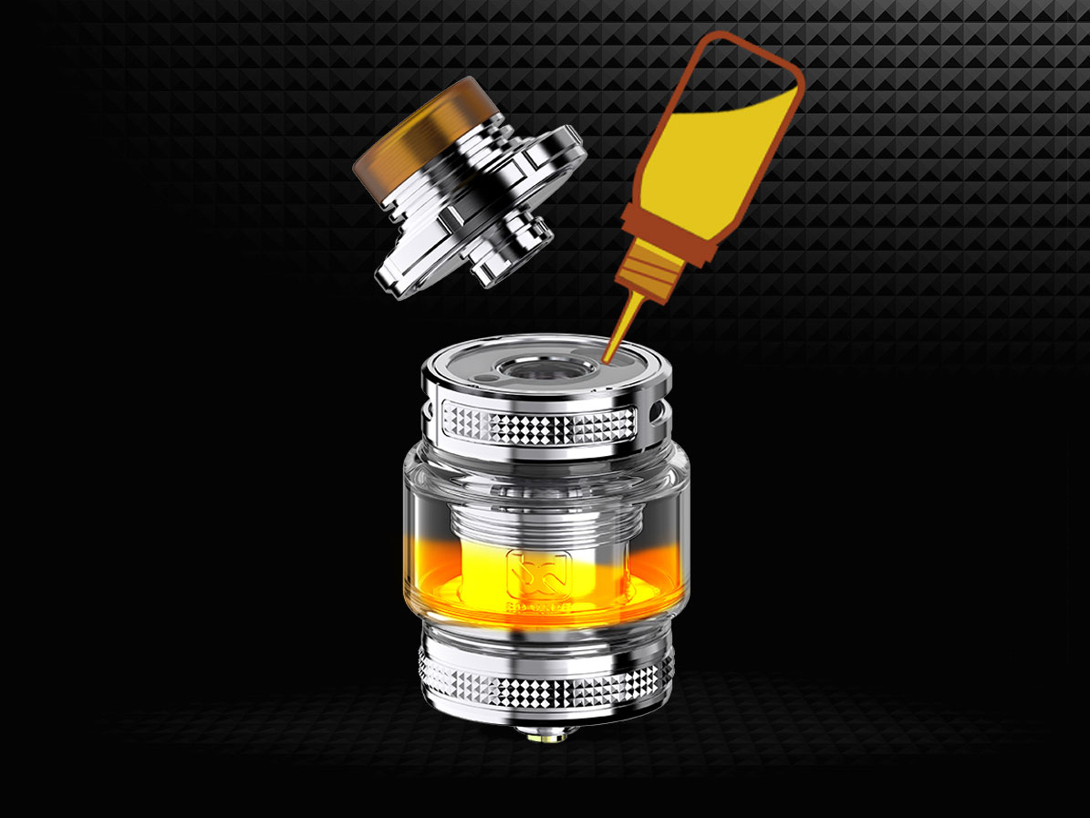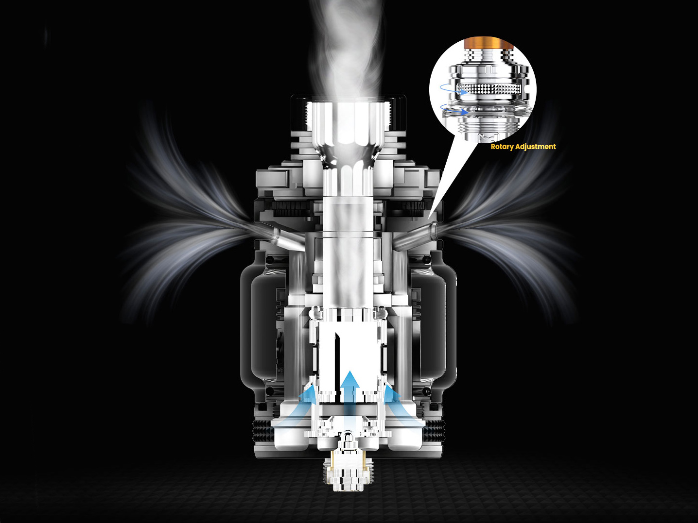 Внутри, на необслуживаемой базе восседает предустановленный испаритель с намоткой на 0,15 Ом. Кроме того, в запасе имеется дополнительный сеточный экземпляр с сопротивлением 0,3 Ом. Стандартную цилиндрическую колбу на 2 мл можно заменить на расширенный вариант емкостью 4,5 мл. Интенсивность обдува регулируется путем вращения верхнего кольца. Заправка осуществляется сверху, через пару широких отверстий на слегка углубленной площадке, под скручивающейся крышкой.