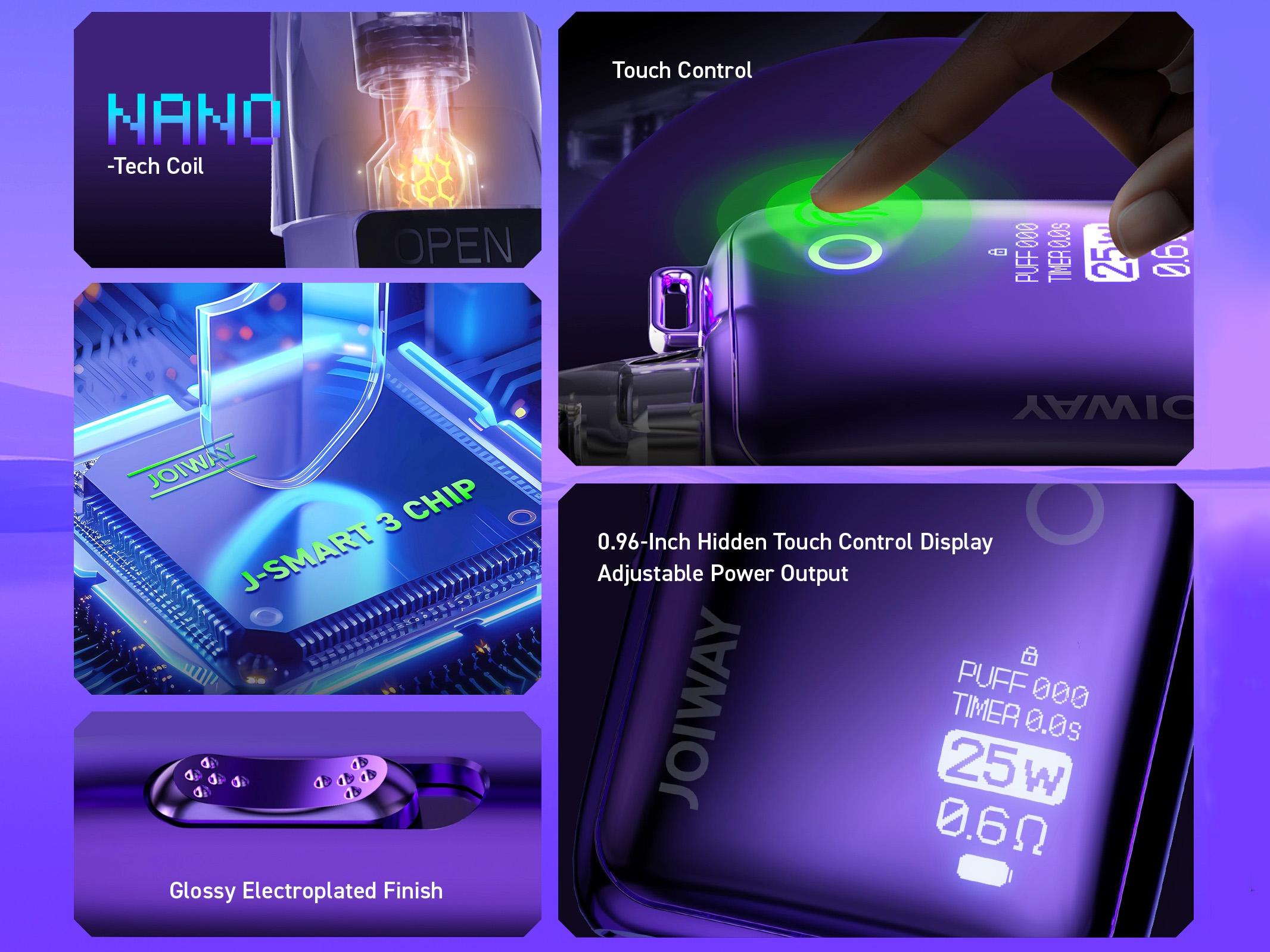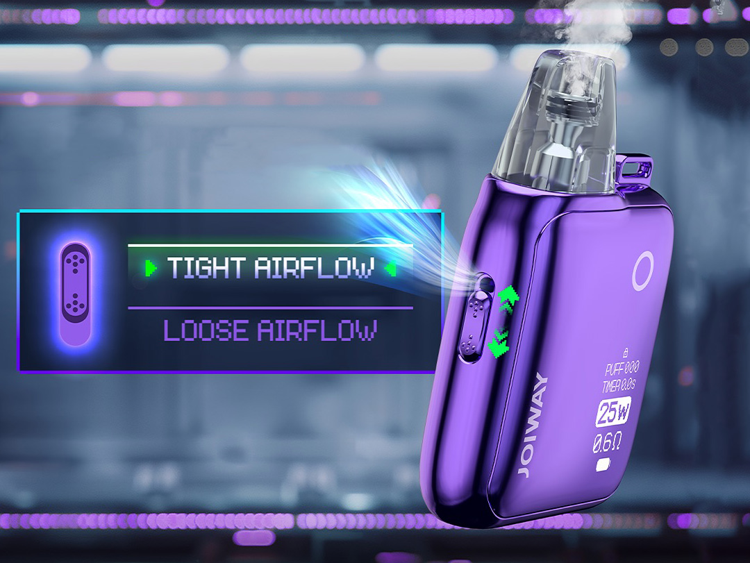 Под-системой руководит регулируемая плата J-Smart 3, поддерживающая мощность до 25 ватт, монохромный интерфейс и два варианта активации — по затяжке либо нажатием кнопки. Помимо того, устройство предусматривает возможность настройки обдува. Источником питания выступает встроенный аккумулятор на 1100 мАч. Зарядка осуществляется через USB Type-C током в 2А. На базе располагается предустановленный картридж со стандартным конструктивом, включающим интегрированный испаритель на 0,6 Ом и слегка увеличенный бак объемом 2,5 мл. В дополнение ко всему, в резерве имеется дополнительный вариант с сопротивлением намотки 0,8 Ом. Заправочное отверстие скрывается на боковой стенке резервуара.