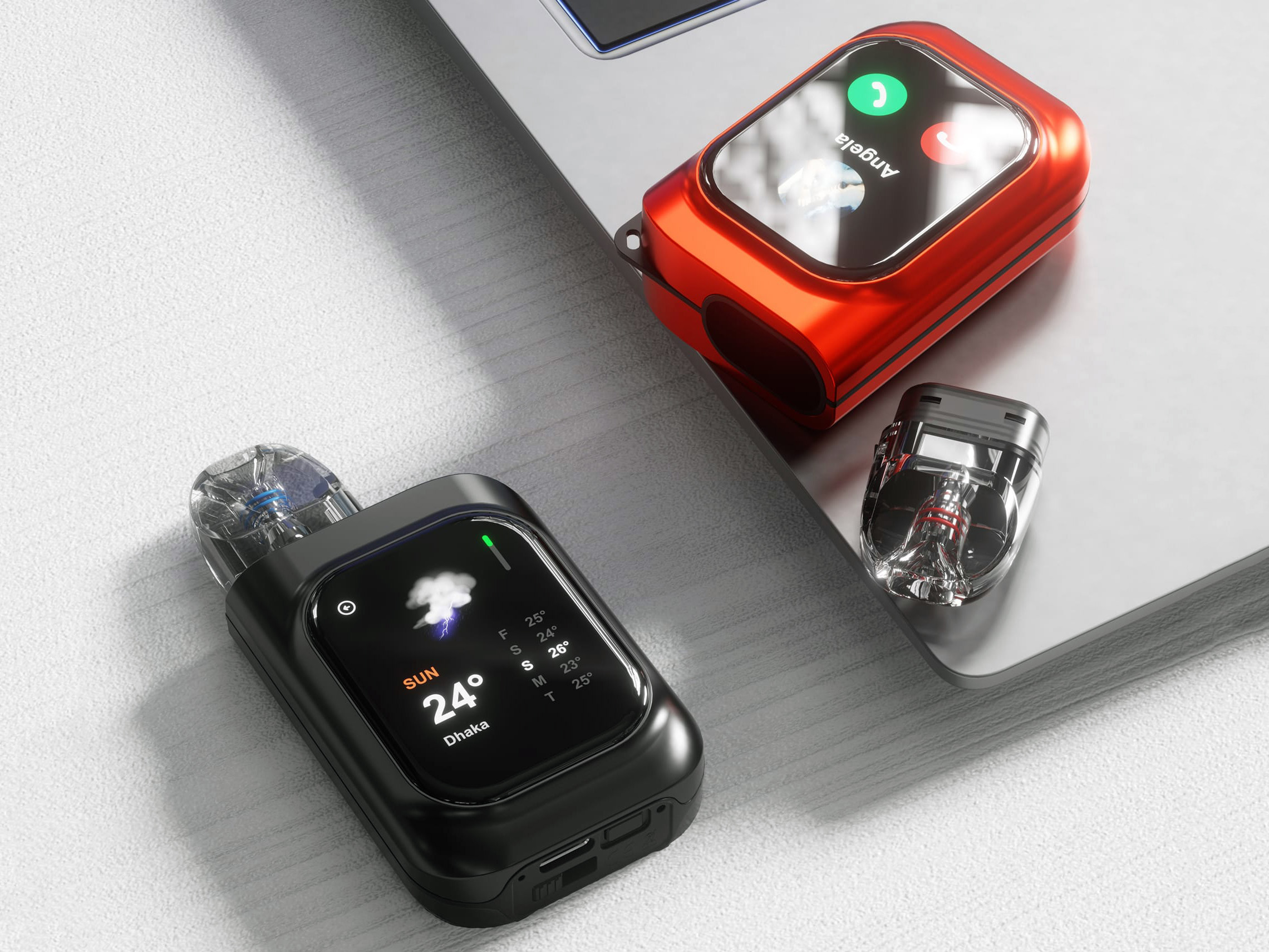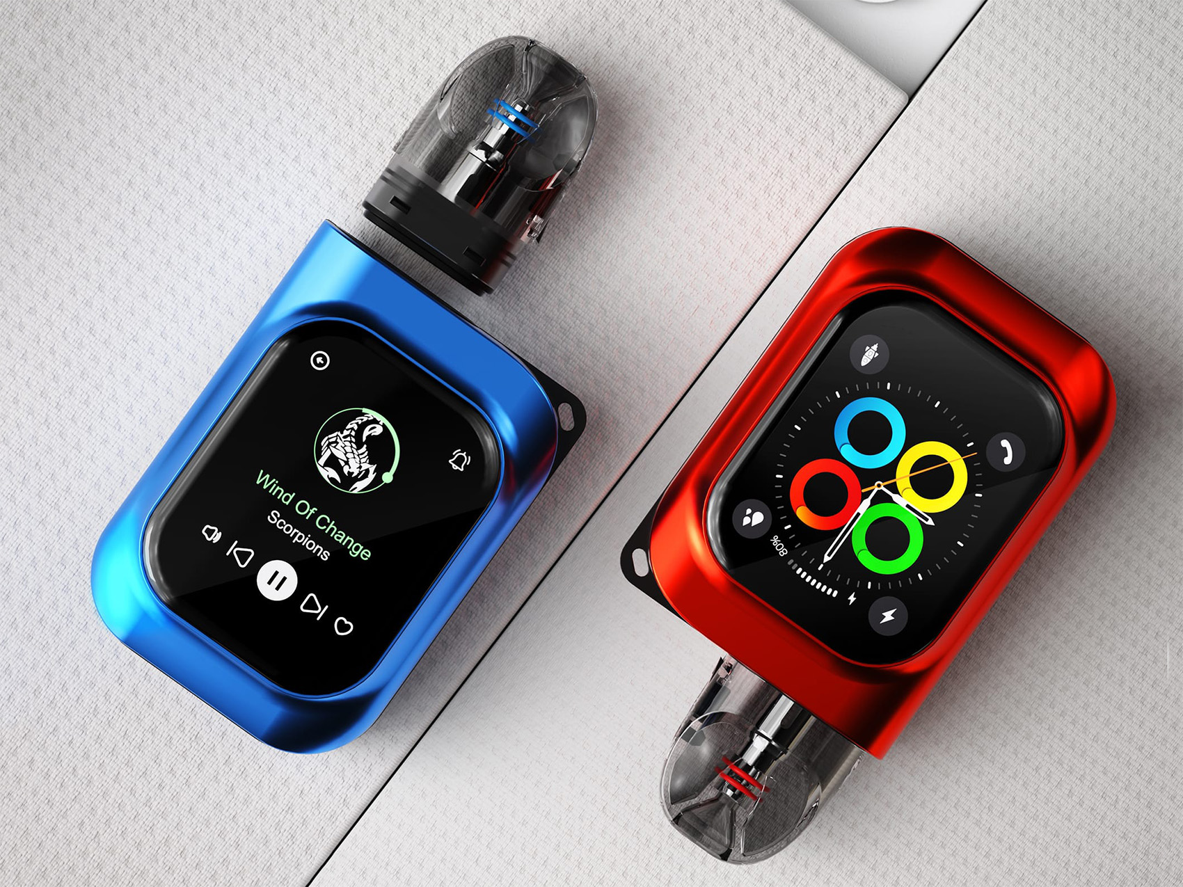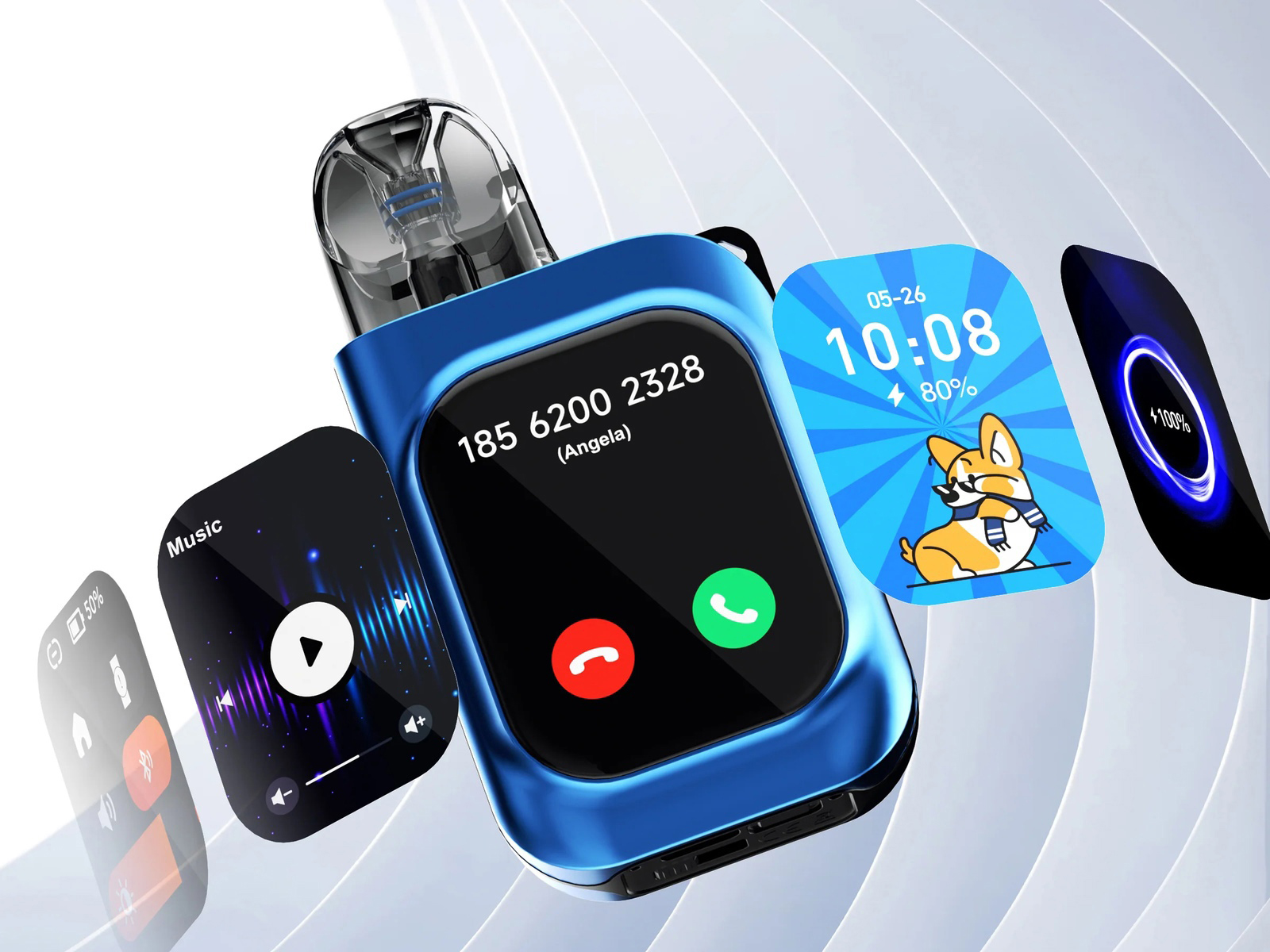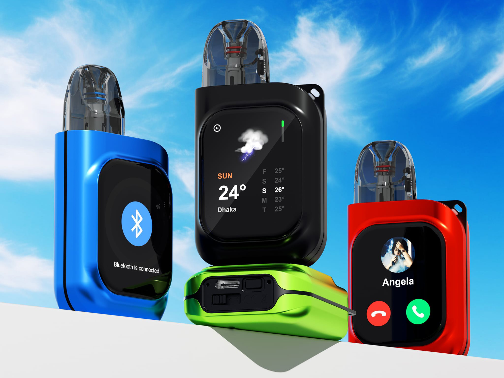 Устройство отличается поистине впечатляющим функционалом, позволяющим подключаться к смартфону через Bluetooth для приема и совершения звонков. Помимо того, под-система поддерживает несколько мини-игр и может воспроизводить музыку. Сенсорный интерфейс предусматривает несколько анимированных тем, возможность визуальной кастомизации, а также различные формы отображения даты, времени, погоды и прочей полезной информации. Мощность на выходе варьируется в пределах трех режимов работы — 16, 20 и 24 ватт. Источником питания выступает батарея на 1000 мАч с зарядным портом USB Type-C. В качестве картриджей предлагаются два сменных экземпляра универсального формата со стандартными баками на 2 мл и интегрированными сеточными испарителями на 0,6 и 0,8 Ом.