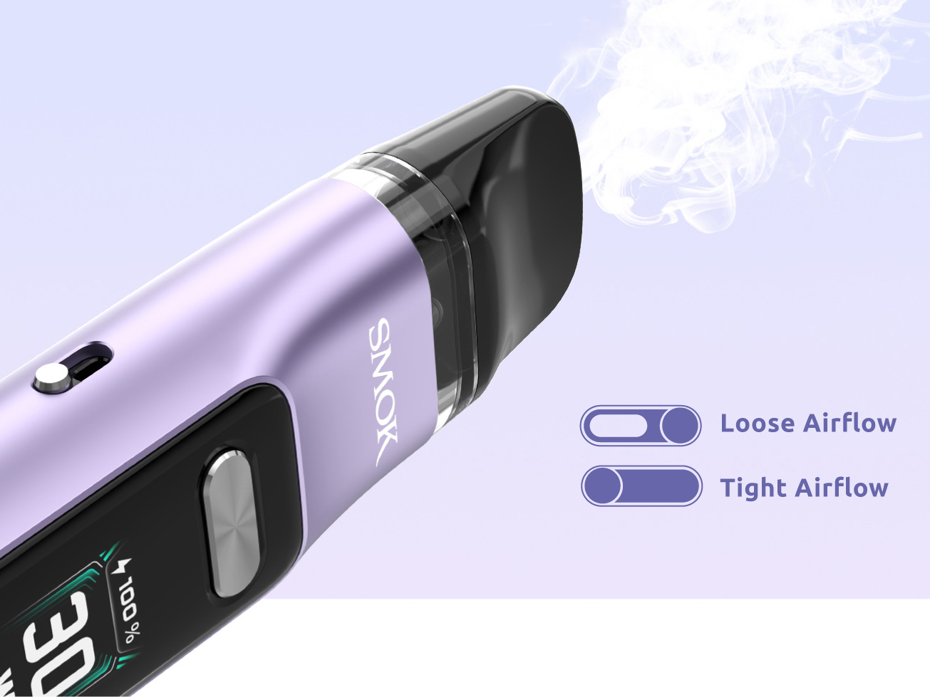 Компактное устройство отличается функциональным цветным интерфейсом с широкой диагональю и вариативной мощностью в пределах от 5 до 30 ватт. Сопротивление варьируется в диапазоне от 0,4 до 2,5 Ом. Зажигание можно осуществлять не только нажатием кнопки, но и посредством затяжки. Интенсивность обдува регулируется при помощи ползунка. Встроенный аккумулятор располагает неплохим запасом в 1300 мАч. Зарядку надлежит производить через USB Type-C порт током в 0,8А. Компанию девайсу составляют два различных картриджа из новой серии с сопротивлением сеточной намотки 0,6 и 0,8 Ом. Кроме того, под-система поддерживает ещё девять экземпляров из предыдущих фирменных линеек.