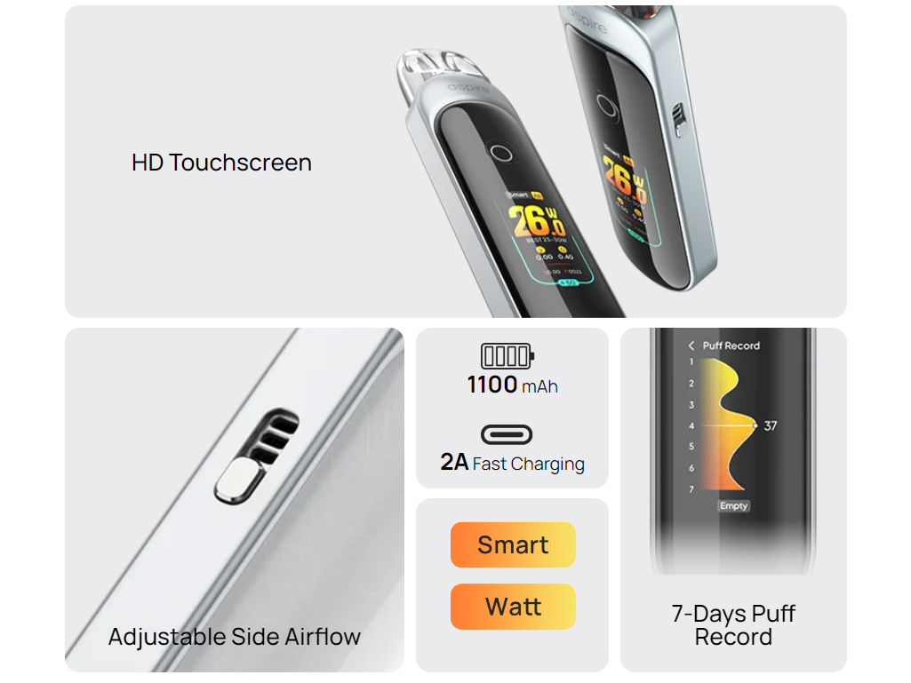 Внутри находится фирменная плата ASP с информативным цветным интерфейсом, сенсорным управлением и двумя режимами работы — Watt и Smart. Мощность на выходе может варьироваться в пределах от 5 до 30 ватт. Зажигание можно производить не только нажатием кнопки, но и по затяжке. Источником питания выступает емкая встроенная батарея на 1100 мАч. За быструю зарядку током 2А отвечает USB Type-C. Поддерживаются три вида сменных картриджей из новой одноименной серии. В базовый набор входят два экземпляра на сеточных испарителях с сопротивлением 0,4 и 1,0 Ом. Резервуар заправляется через боковую стенку и вмещает 3 мл жидкости.