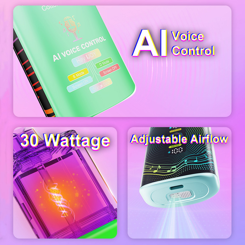 Одноразовый девайс функционирует при помощи оригинальной платы с вариативным цветным интерфейсом, голосовым управлением и двумя режимами работы. Предусматриваются шесть команд на английском языке: «Hey, Ijoy» — активация,«S Mode» — переключение на мощность 30 ватт, «D Mode» — переключение на 18 ватт, «Change Color» — смена цвета, а также «Screen On/Off» для включения и выключения дисплея. Помимо того, предусматривается возможность настройки обдува. Аккумулятор располагает емкостью в 750 мАч. Большой интегрированный бак комплектуется сеточным испарителем на 0,4 Ом и вмещает 20 мл жидкости с концентрацией никотина в 5%.