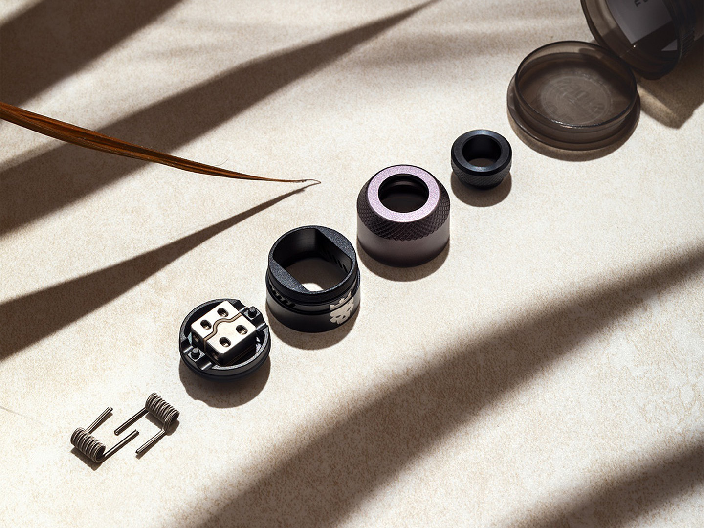 Внутри скрывается минималистичная база с просторной платформой без стоек, предназначенной для фиксации двух спиралей. Ножки намотки надлежит вертикально разместить в овальных слотах и прижать боковыми винтами. На бортах базы имеются полукруглые вырезки для выравнивания спиралей. Воздушные потоки будут поступать на намотку с боков и регулироваться путем вращения купола. Затяжку можно реализовать как в свободном, так и крайне тугом формате.