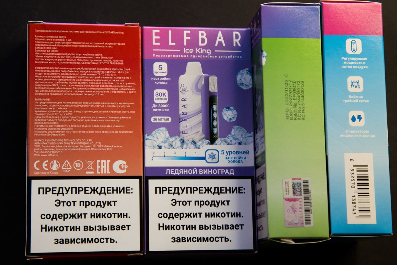 Серия вкусов ELFBAR Ice King поставляется в приятных и не перегруженных оформлением картонных коробках. На лицевой стороне расположено название линейки, описание ключевых преимуществ модели, изображение устройства, название вкуса и предупреждение на белом фоне. На боковых гранях размещены штрихкод, технические особенности и наклейка с кодом проверки подлинности. Обратная сторона отведена под информационный блок: комплектация, описание продукта, состав, предупреждения, юридические данные и маркировки. На крышках находится логотип бренда и ссылка на официальный аккаунт бренда в ВК.