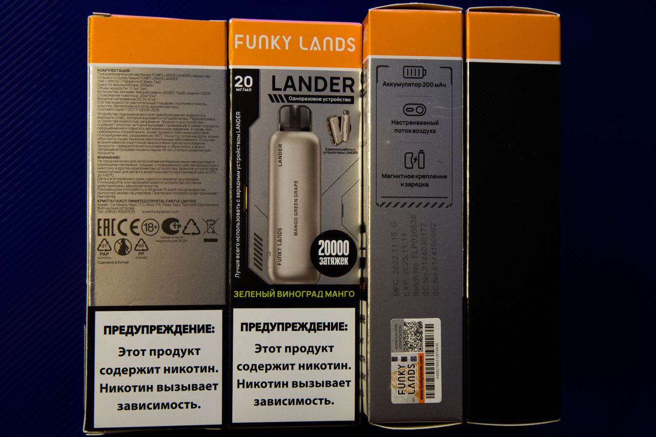 Линейка одноразовых предзаправленных устройств FUNKY LANDS LANDER поставляются в лаконичных строгих коробках. На лицевой стороне расположено название серии, пометка о том, что это одноразовое устройство (Зачем – об этом ниже), содержание никотина, расчетное количество затяжек, название вкуса, изображение устройства и предупреждение на белом фоне. На правой грани размещены ключевые особенности и наклейка с кодом проверки подлинности. Обратная сторона отведена под информационный блок: описание продукта, состав, предупреждения, юридические данные и маркировки.