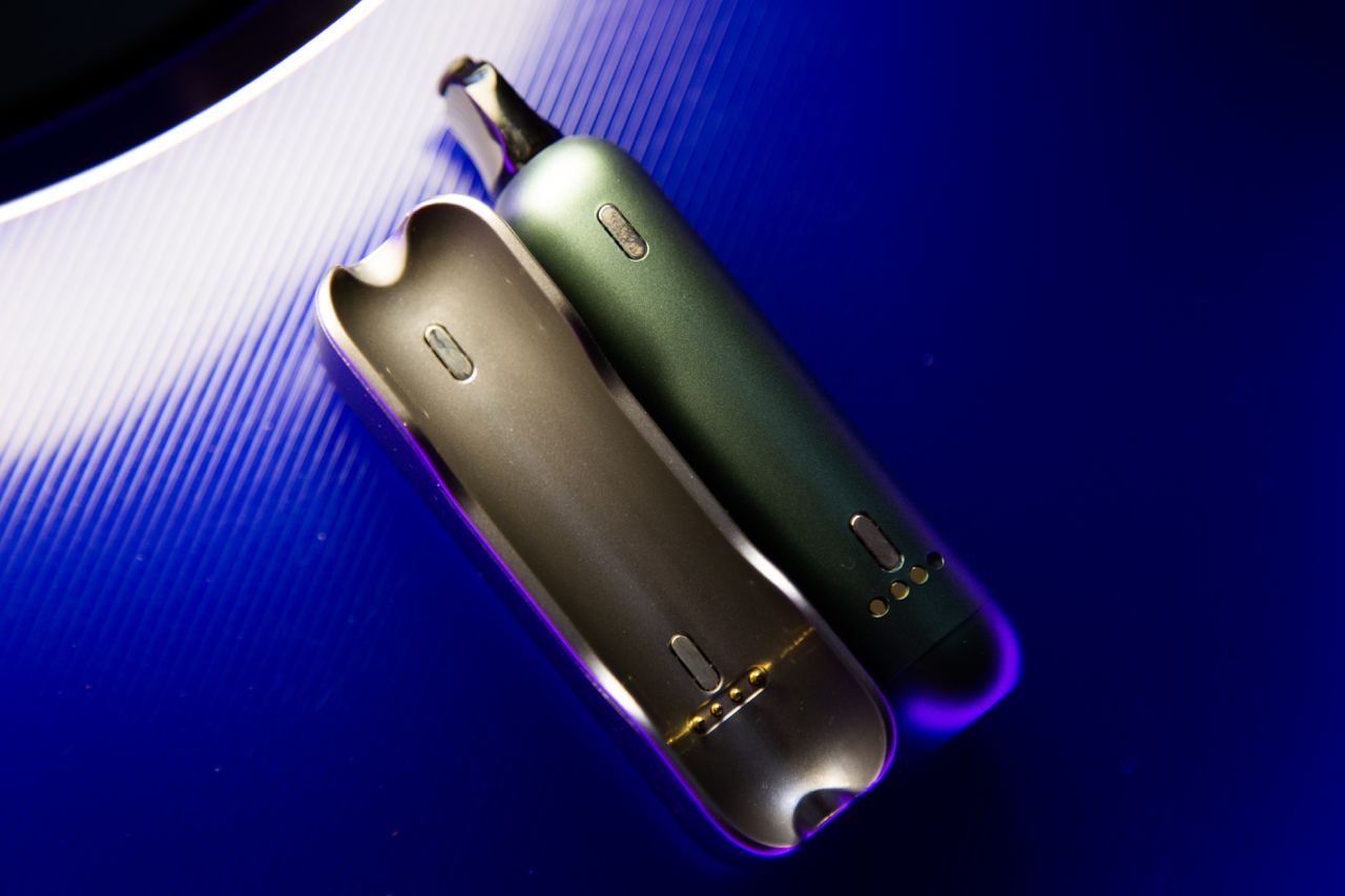 Внутри – сам девайс с тактильно приятным покрытием. На корпусе находятся: названиеа устройства, экран с сенсорной кнопкой, посадочное место для картриджа с магнитами и контактами для сопряжения. Снизу – порт USB Type-C для подзарядки. Использовать устройство можно только при подключении к нему одноразки.