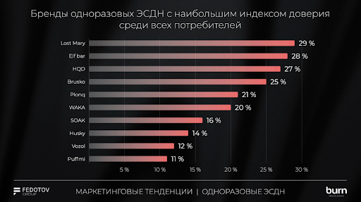 Мировые лидеры среди вейп-брендов ELFBAR и LOST MARY продолжают доминировать в категории одноразовых ЭСДН с момента их выхода на местный рынок. Результаты исследования показывают, что оба бренда демонстрируют самый высокий индекс потребительского доверия среди всех взрослых пользователей: LOST MARY лидирует с 29%, а ELFBAR идет следом с 28%, что укрепляет их позиции как наиболее надежных вейп-брендов.