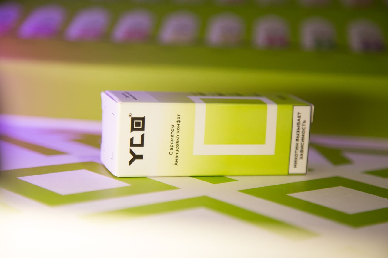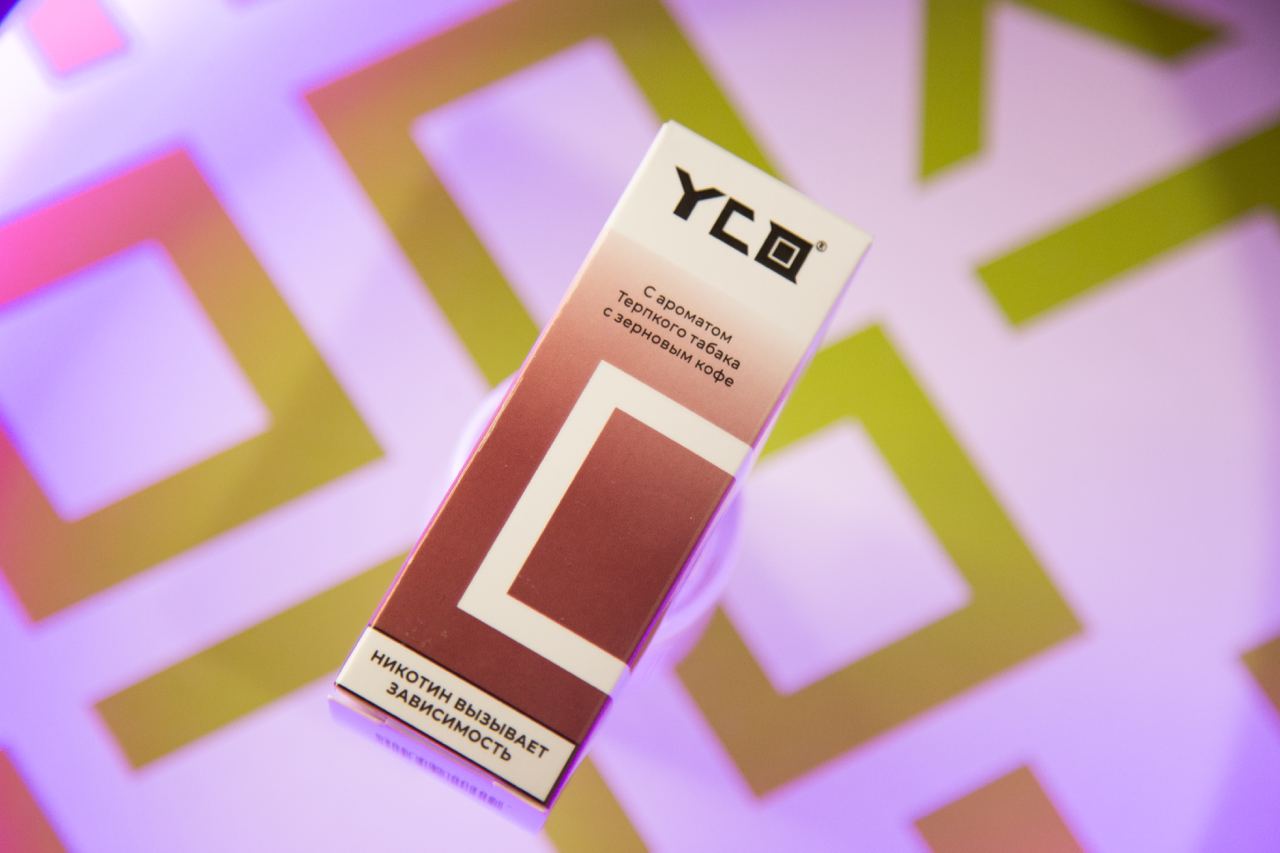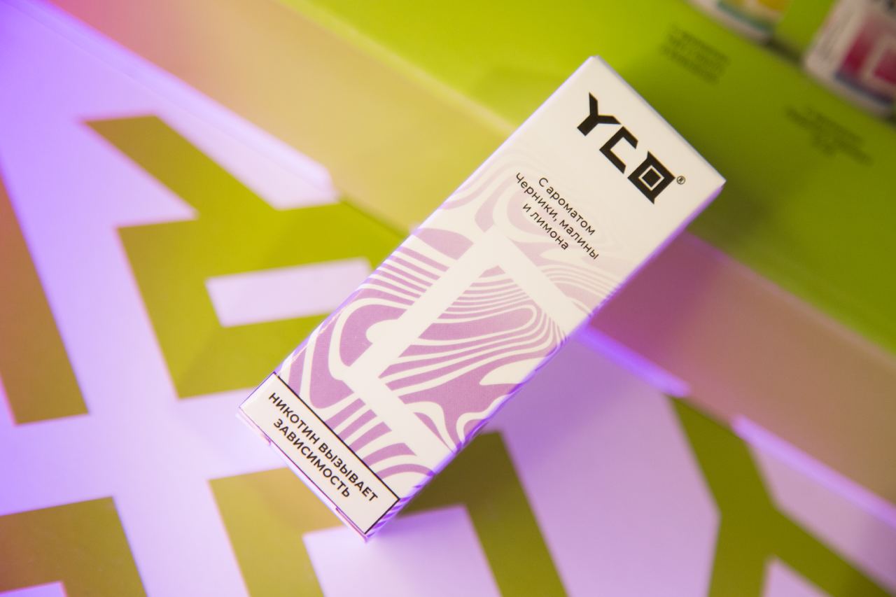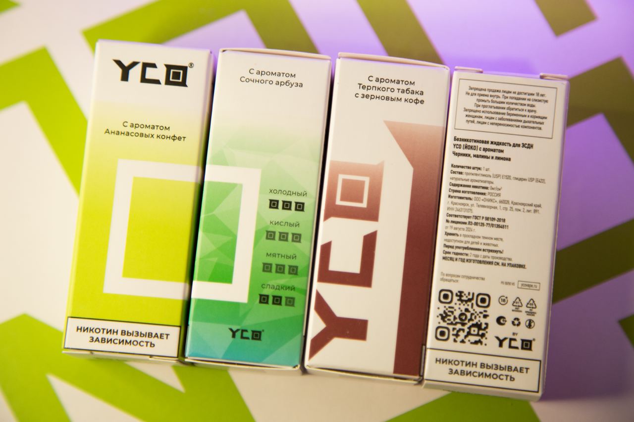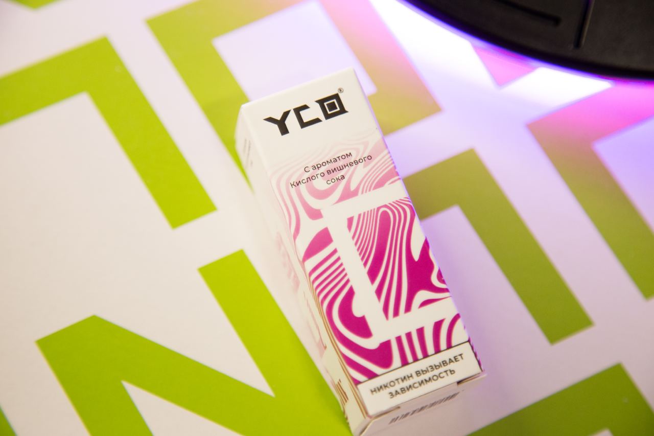Серия жидкости YCO поставляется в стильных белых картонных коробках, как отражение «белого» товара. Цветовая гамма оформления зависит от выбранного вкусового сочетания. На лицевой стороне расположен логотип линейки, название вкуса. Правая грань включает индикацию вкусовых характеристик, а левая — отражает крупный символ компании и дублированное название вкуса. Четвертая грань отведена под информационный блок: состав, предупреждения, срок годности, юридические данные и маркировки.