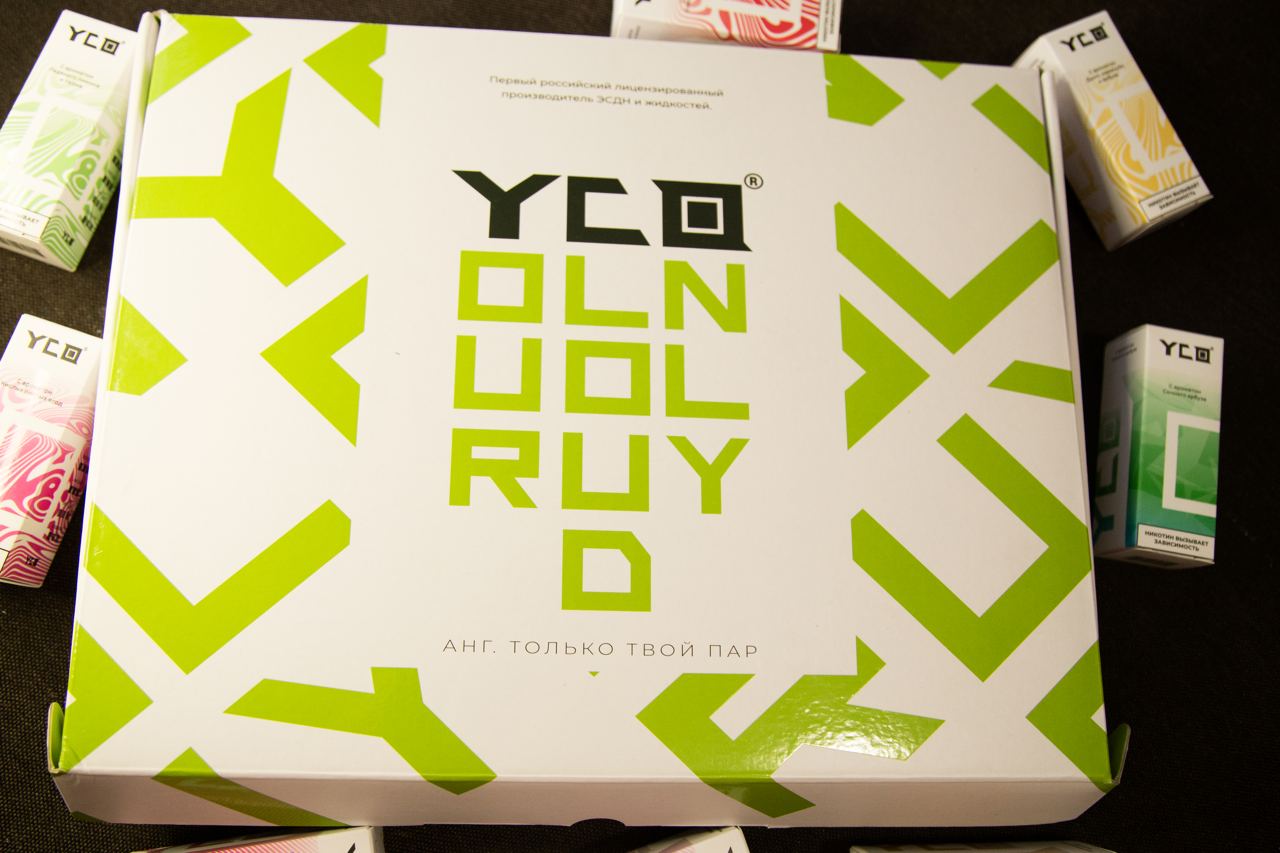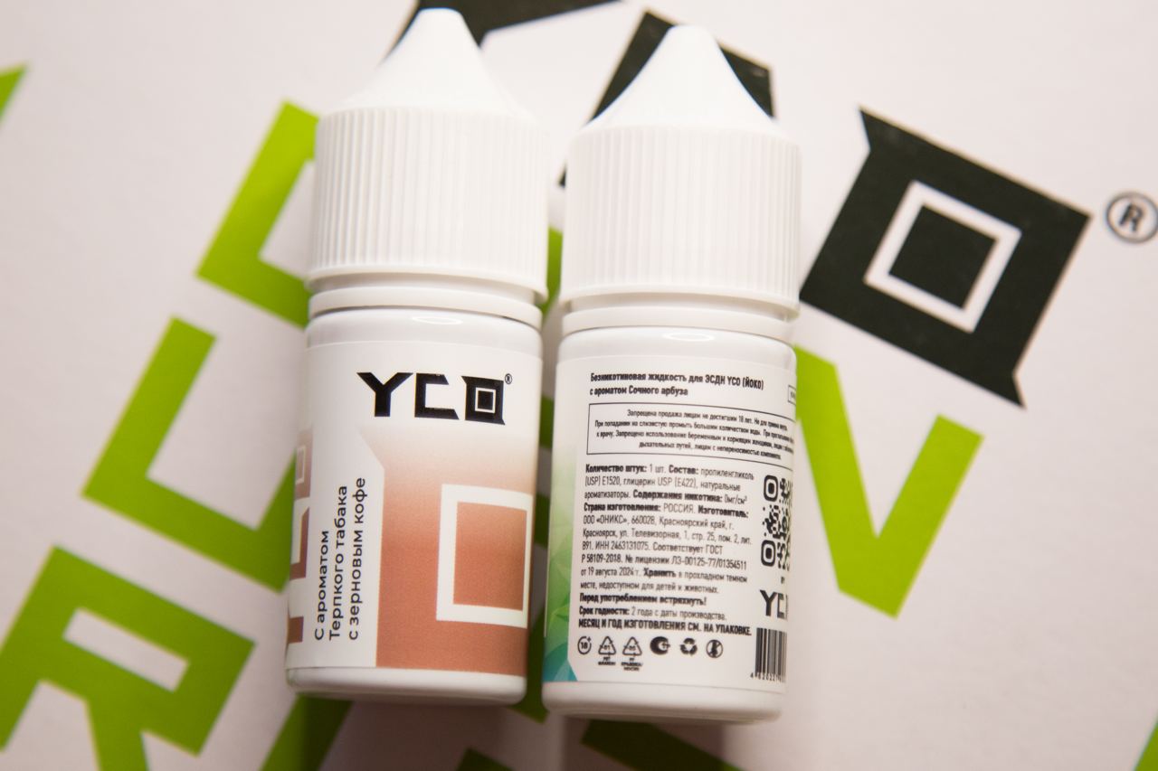 Серия жидкости YCO поставляется в стильных белых картонных коробках, как отражение «белого» товара. Цветовая гамма оформления зависит от выбранного вкусового сочетания. На лицевой стороне расположен логотип линейки, название вкуса. Правая грань включает индикацию вкусовых характеристик, а левая — отражает крупный символ компании и дублированное название вкуса. Четвертая грань отведена под информационный блок: состав, предупреждения, срок годности, юридические данные и маркировки.