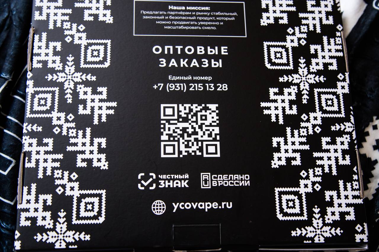 Серия вкусов YCO Siberian поставляется в матовых картонных коробках. Цветовая гамма оформления зависит от выбранного сочетания. На лицевой стороне расположено название линейки, название вкуса на русском языке и предупреждение на белом фоне. Правая грань выделена дублированное название вкуса, индикацию вкусовых характеристик и логотип производителя, а противоположенная – под крупный логотип серии. Четвертая грань отведена под информационный блок: описание продукта, состав, юридические данные, предупреждения и срок годности. Ниже – баланс, QR-код и маркировки.